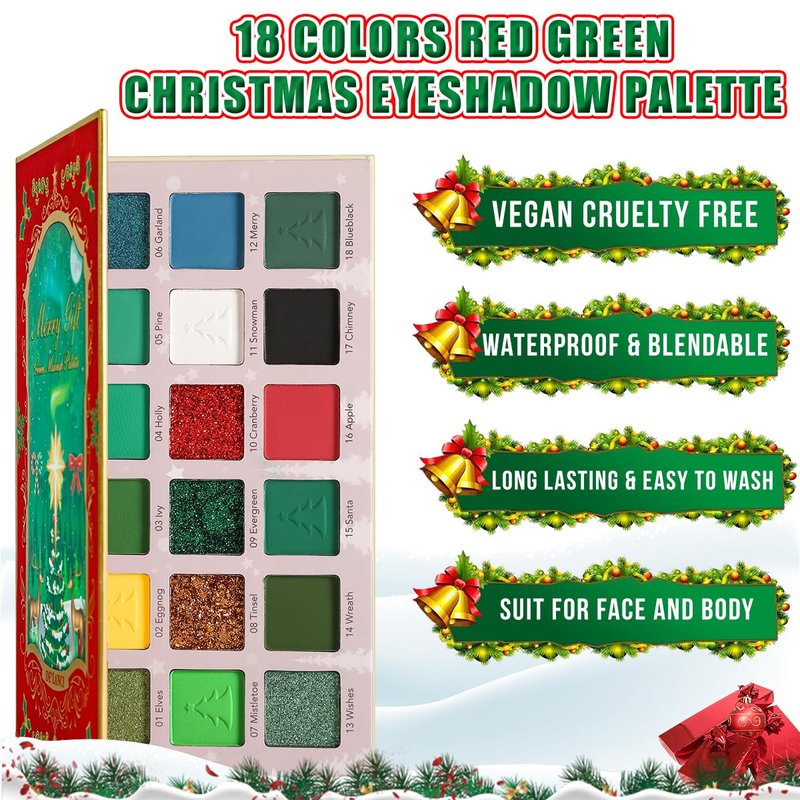 - 💝🎄SUIT FESTIVAL HOLIDAY AND DAILY: Our 18 color red green Christmas eyeshadow palette is suitable for St. Patrick's Day,Christmas theme party,stage,Halloween,music festivals,cosplay and everyday makeup. You can use it to create various of Christmas makeup look, such as Christmas tree eye makeup, snowflake eye makeup, elf eye makeup, Christmas candy eye makeup, mysterious smoky makeup, dreamy color makeup and natural daily makeup.
