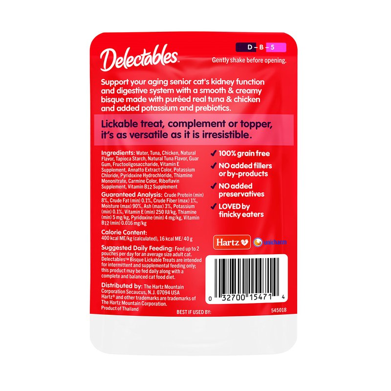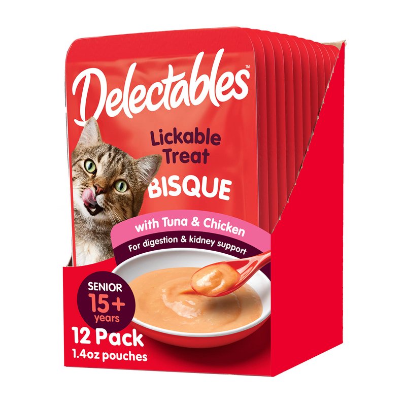 - MANY USES: These delectable cat treats can be used as a quick cat snack or a cat food topper to entice finicky eaters. Hartz Delectables Lickable Cat Treats for Seniors are also available in stew, savory broths, chowder, soft pate, and squeeze ups.