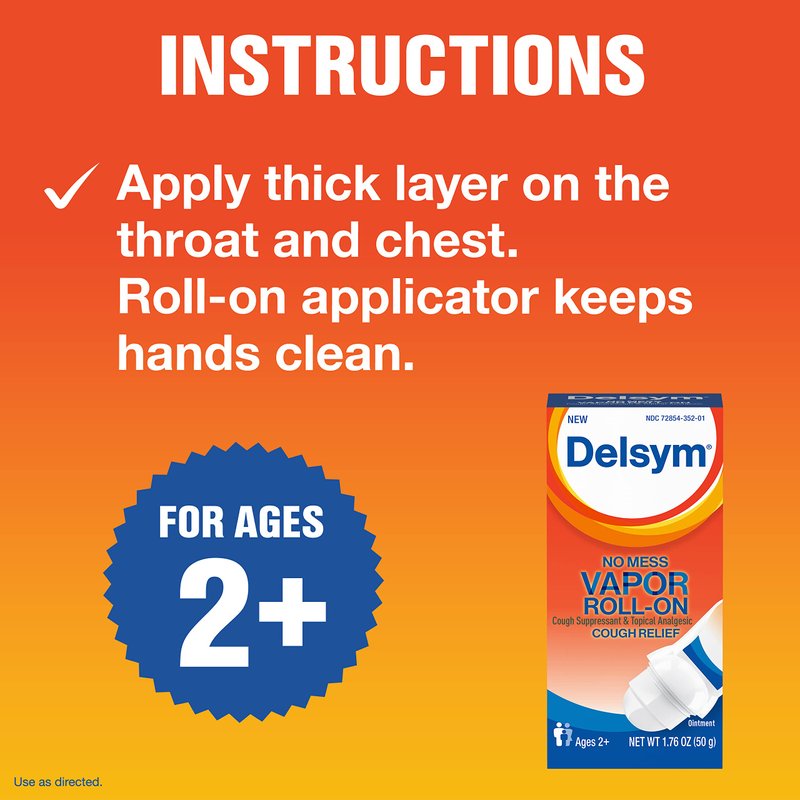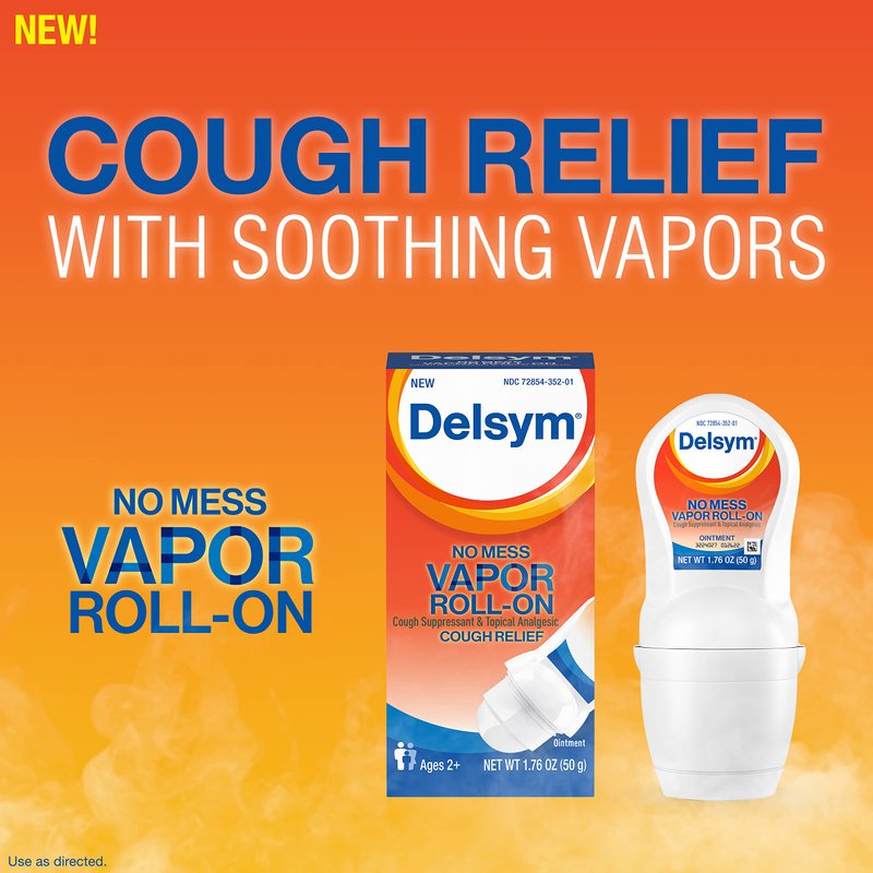 Delsym No Mess Vapor Roll-On Cough Suppressant & Topical Analgesic 1.76 oz with Camphor, Eucalyptus Oil, Menthol, Adults & Kids, Maximum Strength