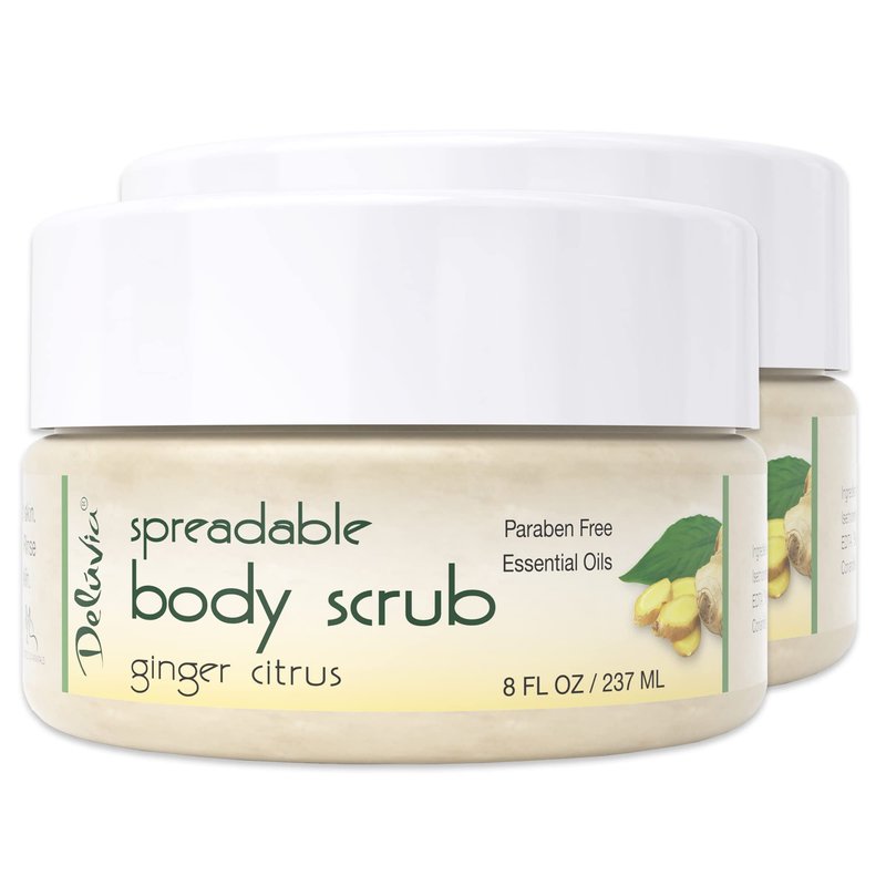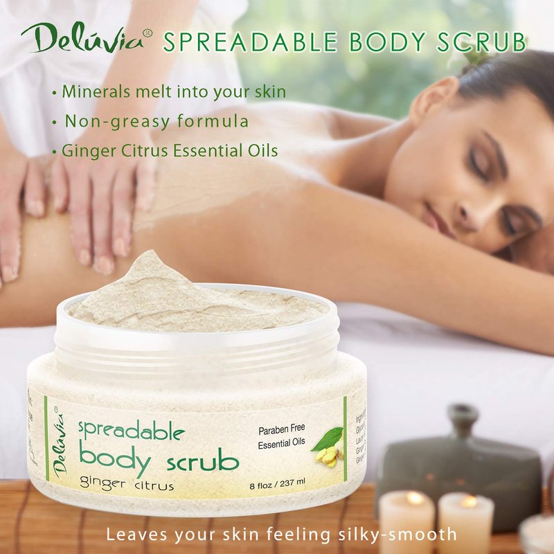 - OUR DELUVIA SPREADABLE BODY SCRUB has a unique, non-oily, creamy texture. It works well on all skin types: dry, oily, combination and sensitive skin alike. Can be used day and night.