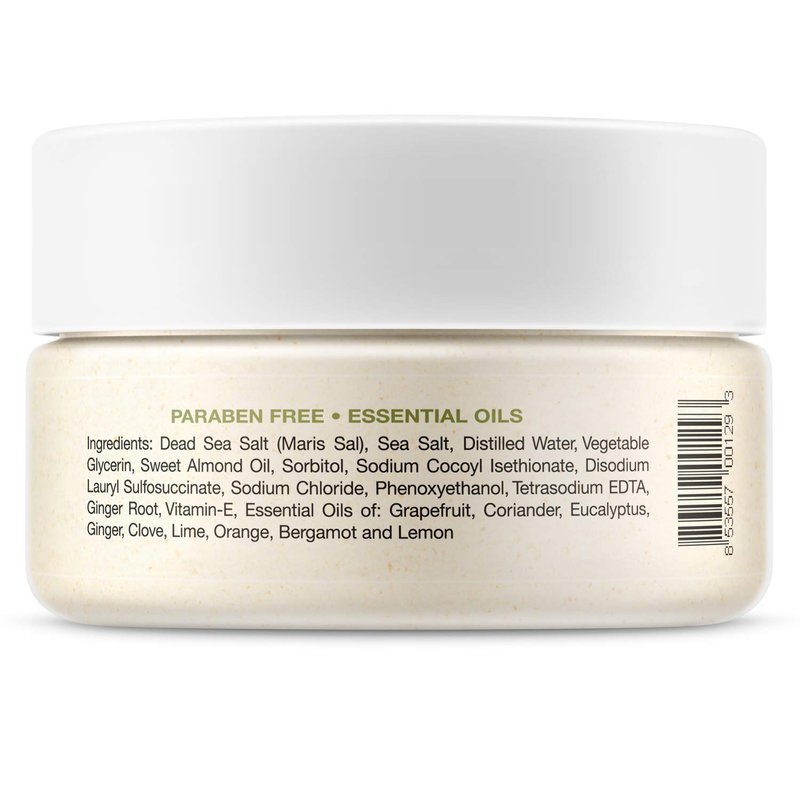 - QUALITY INGREDIENTS FOR MAXIMUM BENEFITS. Our Dead Sea Salt Scrub is made with Sweet Almond Oil, Vitamin E and Essential Oils from Grapefruit, Coriander, Eucalyptus, Ginger, Clove, Lime, Orange, Bergamot and Lemon. It is paraben free, cruelty free and proudly Made in the USA.