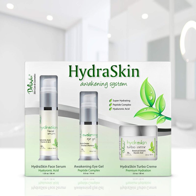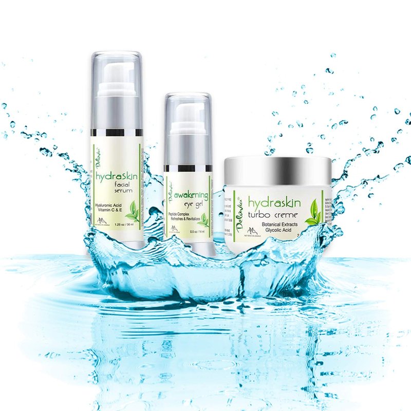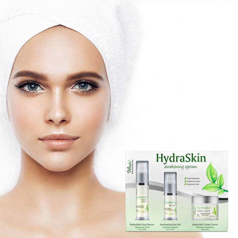 - Our Deluvia Awakening HydraSkin Kit includes our Awakening Eye Gel, Hydraskin Facial Serum and Turbo Night Creme. We use ingredients like Organic Aloe Vera, Pure Vitamin C, Essential Oils and Rosehip Oil to moisturize while Botanical Hyaluronic Acid and AHA can work deep into the skin. Made in the USA and cruelty free.