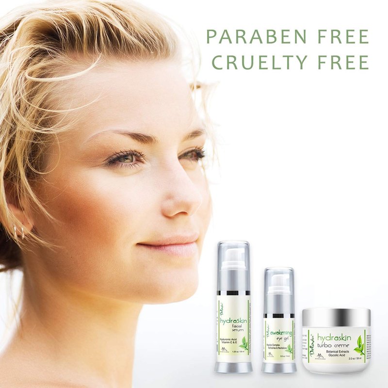 - Our Hydraskin Facial Serum: Made with pure Vitamin C, Botanical Hyaluronic Acid, Organic Aloe Vera, Green Tea, Geranium Essential Oils, Vitamin E and Organic Jojoba Oil. Our Face Serum helps reduce the look of fine lines and wrinkles by increasing moisture and hydration, which are key elements to the youthful looking skin we all desire. It is fragrance-free, paraben-free and cruelty-free.