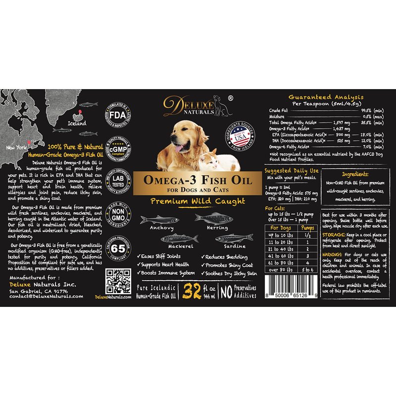 Deluxe Naturals Rich Omega-3 Fish Oil for Dogs & Cats | Natural EPA + DHA Fatty Acids for Shiny Coat, Reduce Itchy Skin, Support Joint Function, Immune & Heart Health, 32 FL OZ