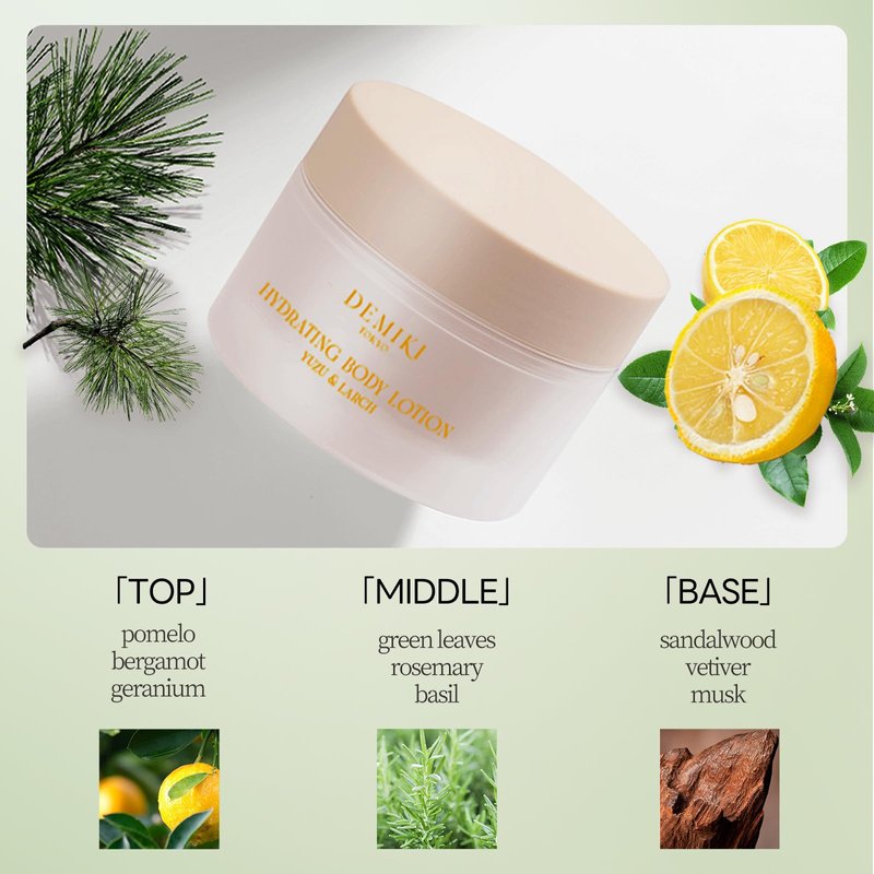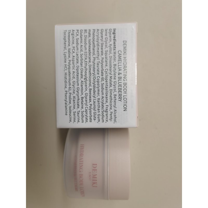 DEMIKI Hydrating Body Lotion, Natural Beeswax and Vitamin E, Blend of Six Essential Moisturizing Ingredients Repairs the Skin’s Surface, Forming a Protective Layer Ingredients:Water, Butylene Glycol, Behenyl Alcohol,Glycerin,Xylitol, Diisosteary Malate, Dimethicone, Penty-lene Glycol,Squalane,Cyclopentasiloxane, FragranceGlyceryl Stearate, Polysorbate 60, Sodium Acrylate/SodiumAcryloyldimethylTaurate Copolymer, Xanthan Gum,Phenoxyethanol,Phytosteryl/Octyldodecyl Lauroyl Gluta-mate,lsohexadecane,Dimethiconol, Beeswax, Polysorbate80, Disodium EDTA,Ethylhexylglycerin, Glyceryl CaprylateGlutamic Acid, Sorbitan Oleate,Allantoin,Betaine, SodiumPCA, Sodium Lactate, Dipotassium Glycyrrhizate, TaurineArginine,PCA,Aspartic Acid,Glycine,Alanine, Serine,Threonine,Valine, Polyquaternium-6l, Proline, lsoleucine,Tocopherol, Lysine HCl, Histidine, Phenylalanine