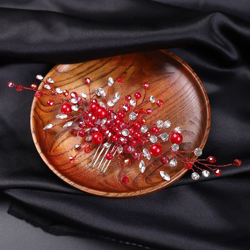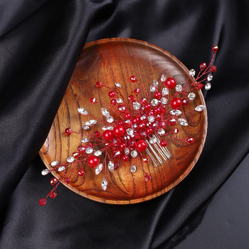 Denifery Red Crystal Hair Comb for Women Red Pearl Wedding Bridal Hair Piece Boho Hair Accessories for Prom Party