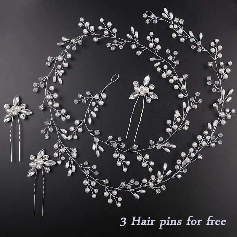 Deniferymakeup Bridal Rose Gold and Gold Silver Extra Long Pearl and Crystal Beads Bridal Hair Vine Wedding Head Piece Bridal Hair Accessories Headband Hair Jewelry Hair Accessories (Silver)