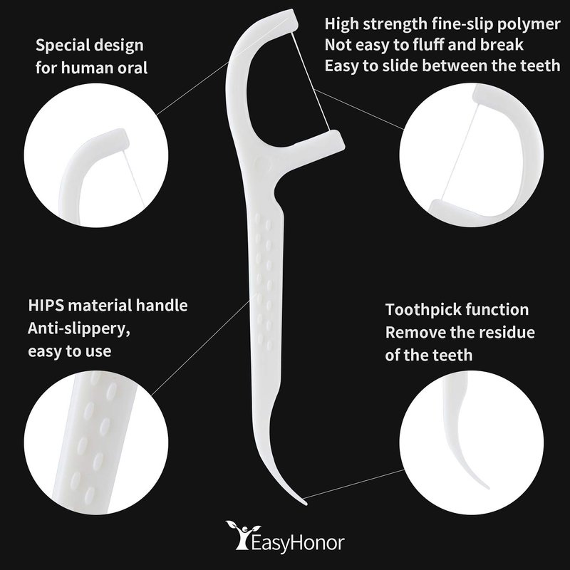 EasyHonor's thread is made of polymer material, the thread is the high strength and smooth, the floss is easy to slide between the teeth, and they are not easy to break; its handle is food grade material ABS polystyrene, more durable.
