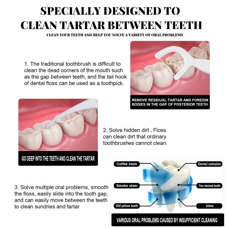 - 2-in-1 Function Design:Dental floss can remove excess residue, remove plaque that the toothbrush cannot reach, and keep teeth clean. It can also be used as a toothpick.The middle part adopts a convex design to enhance the hand feeling and save effort and protect the teeth.