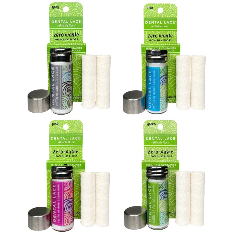Dental Lace Pack of 4 Colors New Refillable Dental Floss Containers with Recyclable Packaging