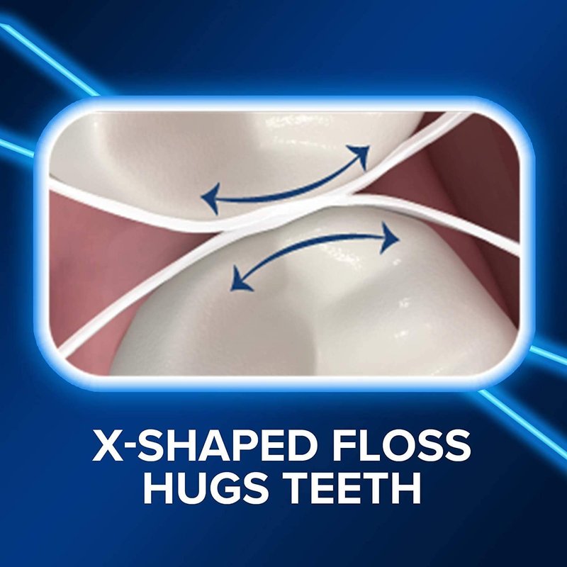 - Unique 2x Cross Floss design curves around teeth to clean better