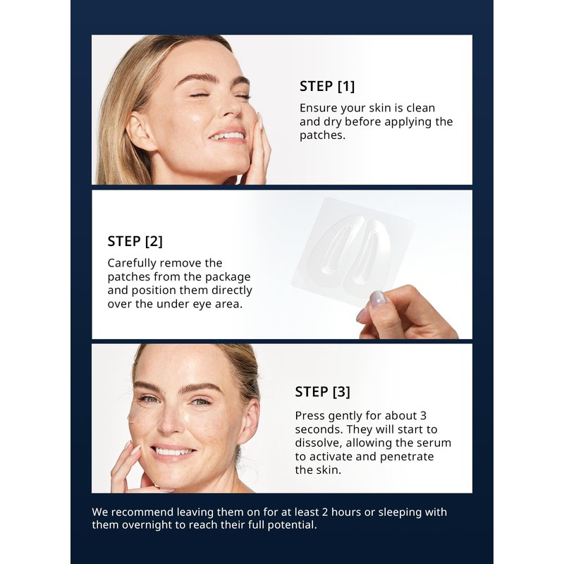 - [ How to Use ]: Carefully remove the patches from the package and position them directly over the desired area, press gently for about 3 seconds. They will start to dissolve, allowing the serum to activate and penetrate the skin. We recommend leaving them on for at least 2 hours or sleeping with them overnigh.
