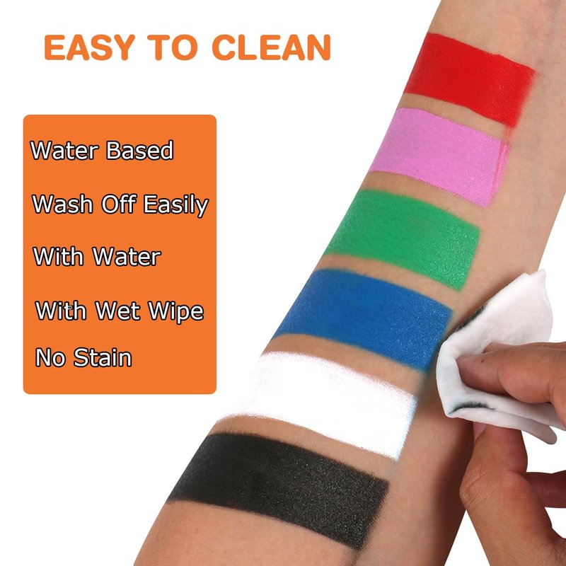 - Easy on and off : Not too thick or too runny,Easy to blend and goes on smoothly,with brush,sponge or your fingers.You can easy wash off with water or wet wipes,not even with soap.