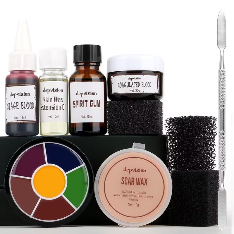 Depvision Halloween SFX Makeup Kit - Scar Wax with Spatula, Spirit Gum,Skin Wax Extension Oil,Scab Coagulated Blood, Stipple Sponges,Fake Blood,6 Colors Bruise Wheel for Special FX,Halloween and Theatrical Makeup