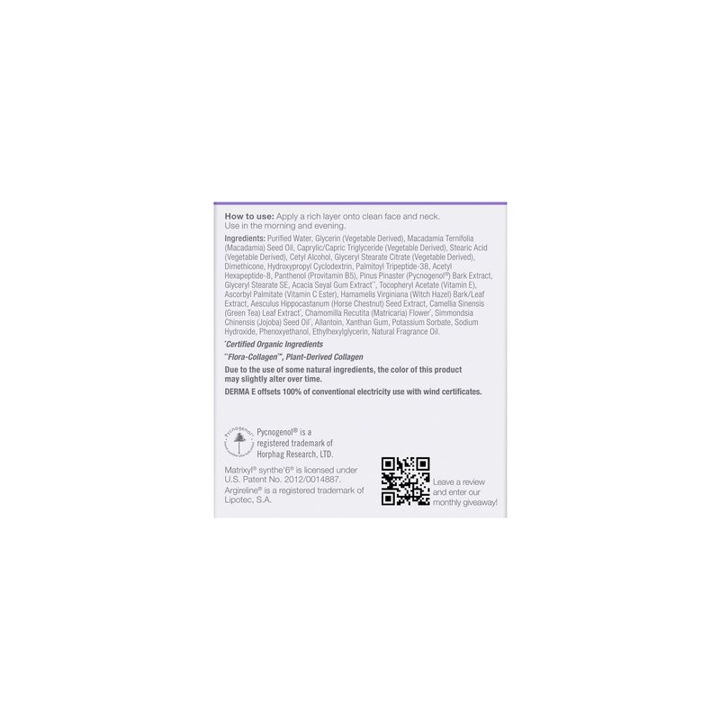 This revolutionary double-action peptide cream visibly softens and smooths the appearance of lines and wrinkles, leaving skin looking more plump and feeling more supple. The nourishing and rejuvenating face cream for mature skin visibly improves skin tone and texture while replenishing and intensely hydrating. We use the powerful multi-peptide Pycnogenol from Pine Bark to support healthy collagen, which is essential for vibrant skin with smoothness and elasticity. Along with plant based collagen and multi-peptides, the facial serum is packed full of clean, natural skin-loving ingredients: antioxidant Green Tea richly nourishes and protects; Panthenol (Provitamin B5) smooths and conditions; Vitamin C Ester brightens, Vitamin E nourishes and hydrates; and Jojoba Seed Oil helps reduce visible signs of dryness and redness. Suitable for use day and night, thoroughly cleanse the face and neck before use. Apply a rich layer of the collagen peptide facial cream to the skin, gently massaging in until absorbed. The face cream is effective on its own or can be paired with a peptides and collagen serum. For even more effective results, this anti-aging face cream can be used along with the rest of the DERMA E Skin Restore regimen. In independent clinical studies on the Skin Restore line, 100% improved skin elasticity*. DERMA E Advanced Peptides and Flora-Collagen Moisturizer is 100% vegan and cruelty-free, and does not contain parabens, sulfates, mineral oil, lanolin, gluten or GMOs. We Refuse to Use over 2500 ingredients that are harmful to our person or the environment, and our list continues to evolve. Our products bring our customers the most effective natural skin care possible. *Based on efficacy results from independent 6-week clinical studies on the Skin Restore line.