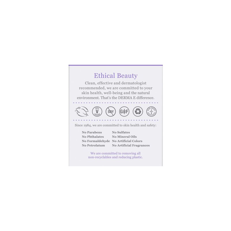 - DERMA E: Clean beauty products that harness nature’s most effective ingredients. 100% vegan and cruelty-free, our eco-ethical skin care products contain no parabens, sulfates, mineral oil, petrolatum, lanolin, gluten, soy or GMOs.