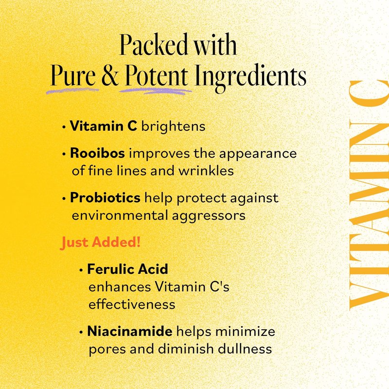 - ALL NATURAL FORMULA: Packed full of powerful natural ingredients: Vitamin C has skin brightening and anti-aging properties; Probiotics protect skin from environmental stressors; and Rooibos reduces the appearance of line and wrinkles