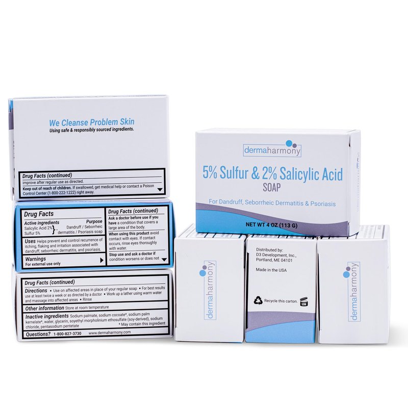 DermaHarmony 5% Sulfur and 2% Salicylic Acid Body and Facial Soap helps prevent and control recurrence of itching, flaking and irritation associated with dandruff, seborrheic dermatitis, and psoriasis. The soap, a registered OTC drug, is safe for daily use by adults and children. We've kept the ingredients as natural as possible (see ingredients list below).