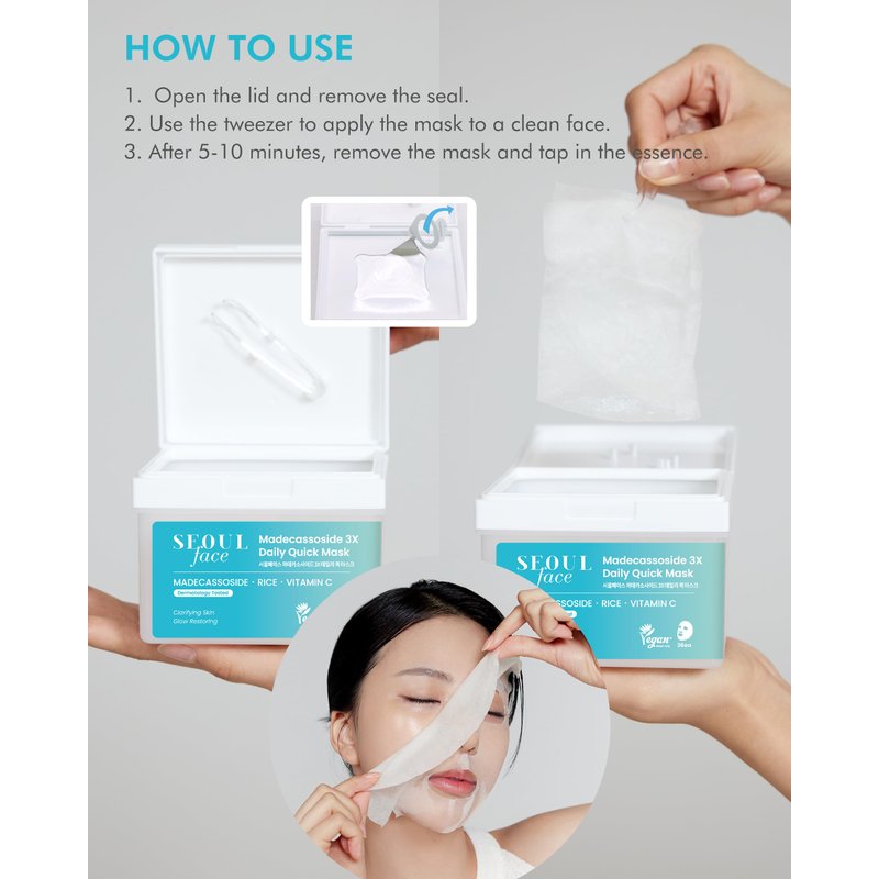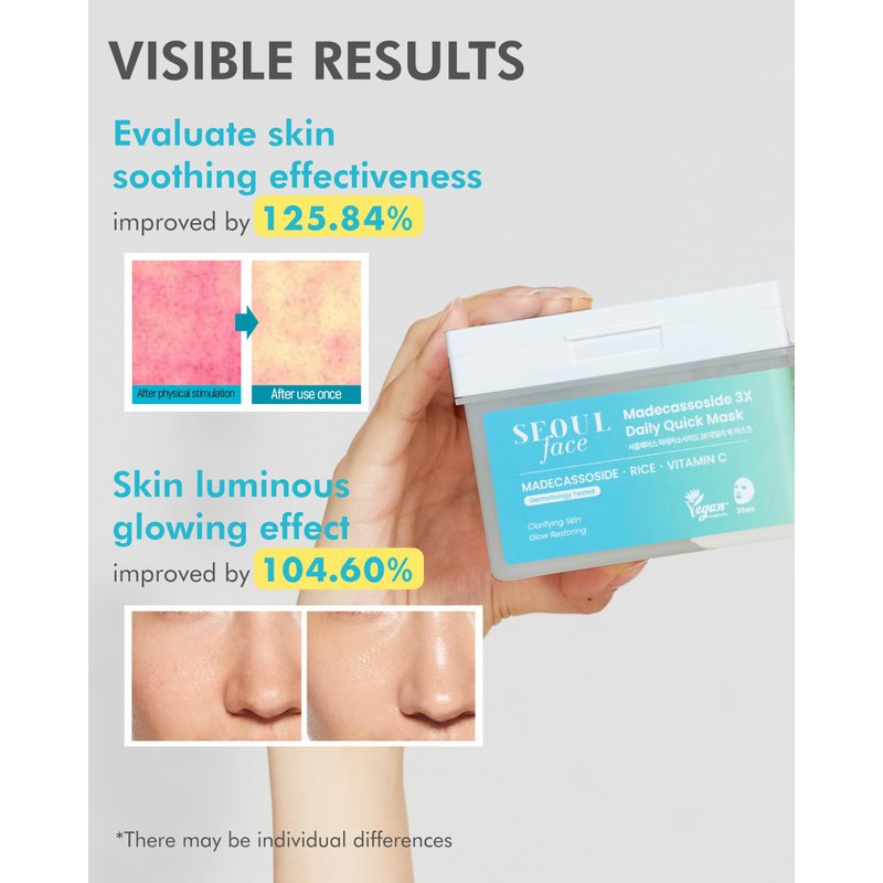 - SOOTHING AND REGENERATIVE FORMULATION: The SEOUL Face Madecassoside 3X Daily Quick Mask is uniquely formulated with Super Centella, featuring a blend of Madecassic Acid, Asiatic Acid, Madecassoside, and Asiaticoside. This dynamic combination aids in controlling collagen synthesis and providing rapid relief to irritated skin. Regular use helps speed up skin regeneration, promoting a quicker recovery from skin damage and maintaining a healthier, more resilient skin barrier.
