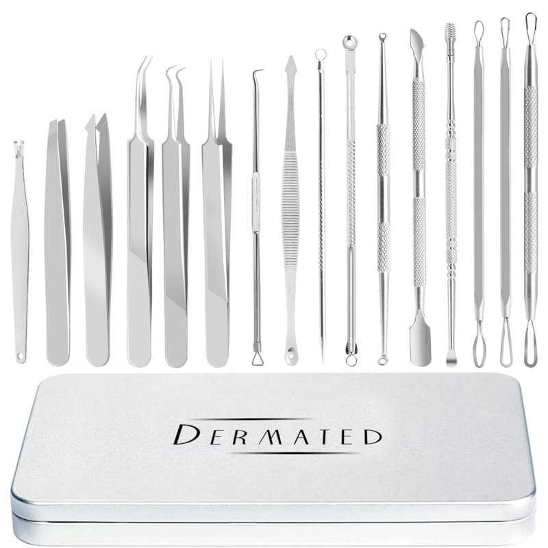 Dermated [16 Pack] Blackhead Remover Tools Pimple Popper Tool Kit | Stainless Steel Professional Pimple Extractor Tool Kit for Blackheads, Blemish, Comdone, Acne, Zit, and Whiteheads for Face & Nose