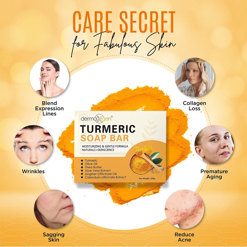 - BLEND OF TURMERIC: Turmeric and a natural ingredient blend minimize expression lines and wrinkles, age spots, sagging skin, and collagen loss and control the premature aging process. Daily use of turmeric soap gives a radiant glow to your skin. You will notice hydrated and moisturized skin in 2 weeks—a youthful complexion by restoring the moisture balance to reveal younger, supple skin.