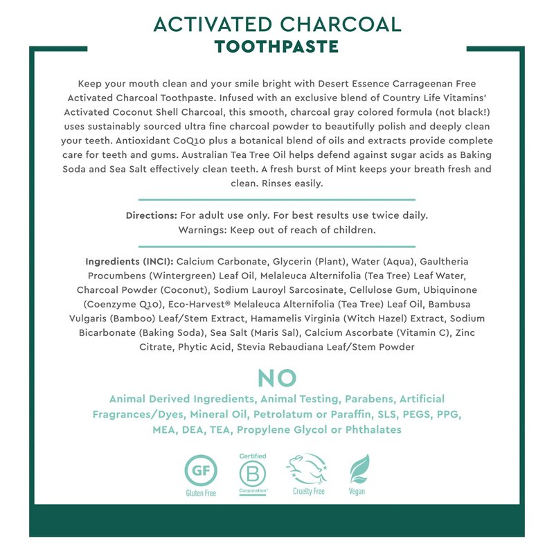 Desert Essence Activated Charcoal Toothpaste - Fresh Mint - 6.25 Ounce - Complete Oral Care - Deeply Clean - Tea Tree Oil - Baking Soda - Sea Salt - Carrageenan Free - Refreshes Breathe