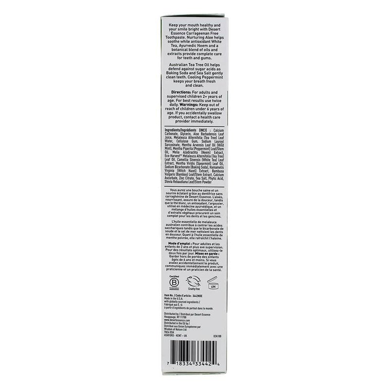 Desert Essence Aloe & Tea Tree Oil Toothpaste - Peppermint - Ideal For Sensitive Teeth & Gums - Complete Oral Care - Aloe - Tea Tree Oil - Baking Soda - Refreshes Breathe - Carrageenan Free