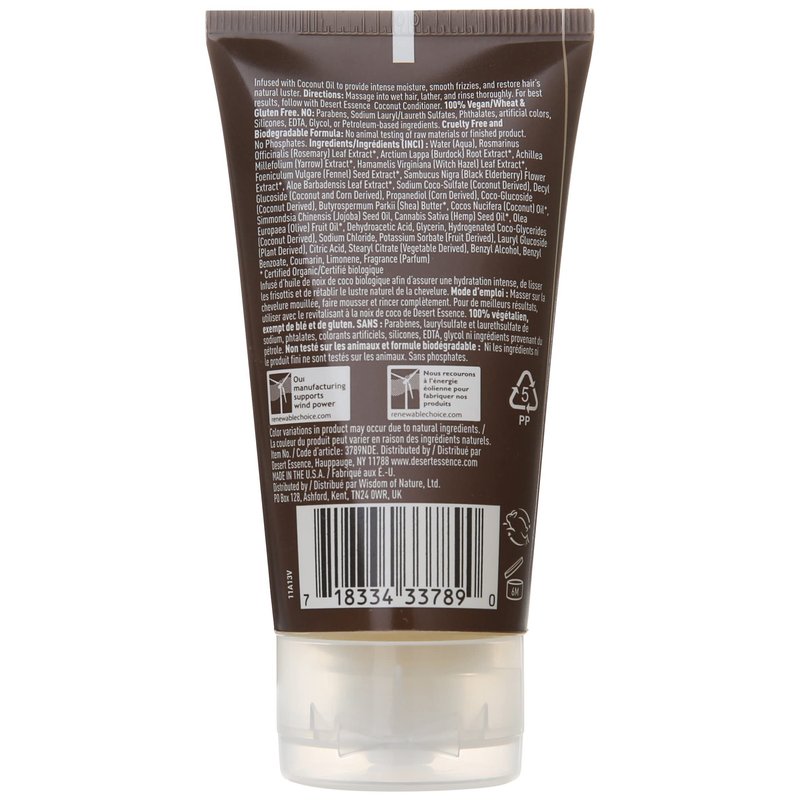 Desert Essence Coconut Shampoo, Nourishing for Dry Hair, Moisturizing, Softening, Hydrating, Anti-frizz, Olive Oil, Aloe Vera, Shea Butter, Paraben & Cruelty Free, 1.5 Fl Oz