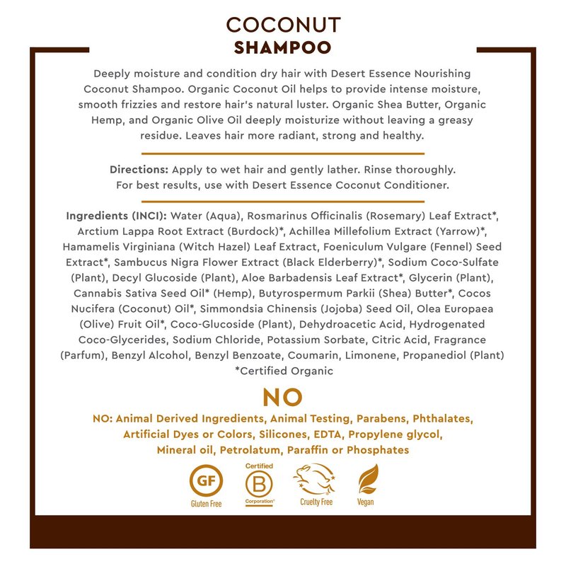 Desert Essence Coconut Shampoo – Nourishing, Paraben-Free, Mineral Oil Free, Vegan, Moisturizing Shampoo for Dry, Damaged Hair - Infused with Natural Coconut Oil, 8 fl oz