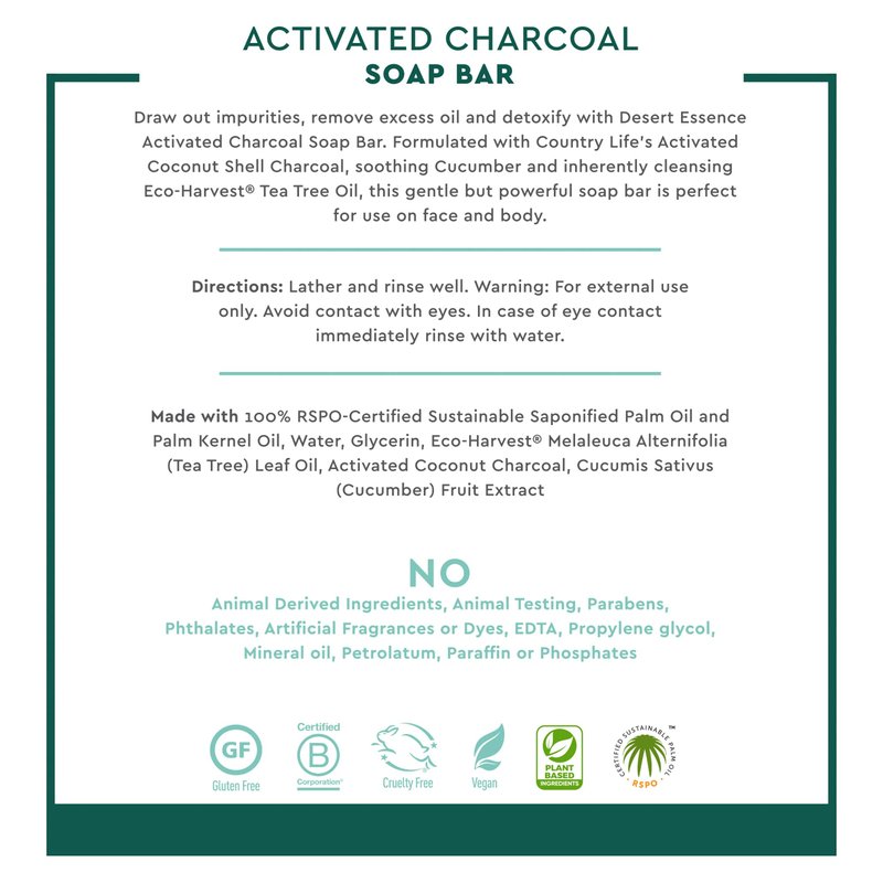 Draw out impurities, remove excess oil and detoxify with Desert Essence Activated Charcoal Bar Soap. Formulated with activated coconut shell charcoal, soothing cucumber, and inherently cleansing eco-harvest tea tree oil, this gentle but powerful soap bar is perfect for use on the face and body.