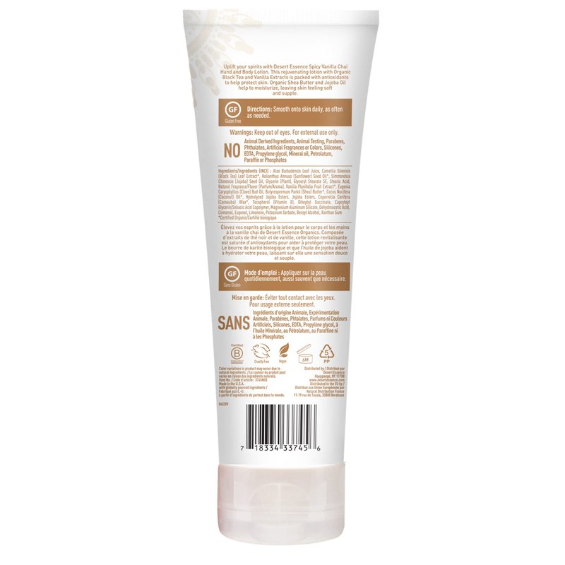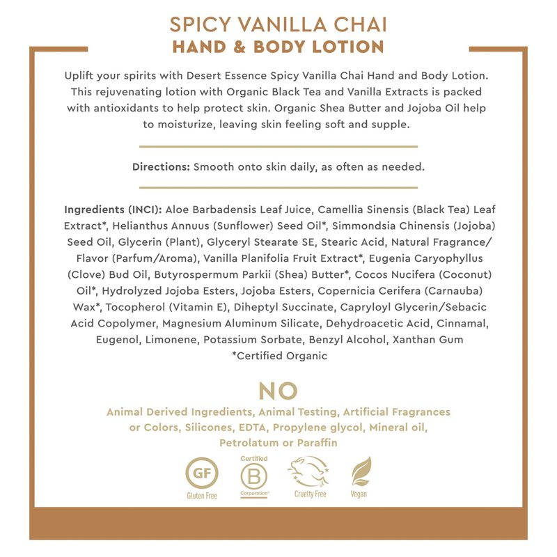- NSF ORGANIC STANDARD - Desert Essence spicy vanilla chai hand and body lotion uses natural ingredients and is certified to NSF organic standards.