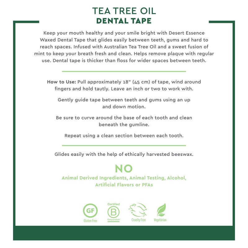 Keep your mouth healthy and your smile bright with this waxed tape that glides easily between teeth, gums and hard to reach spaces. Infused with Australian Tea Tree Oil and a sweet fusion of mint to keep your breath fresh and clean. Helps remove plaque with regular use. Dental tape is thicker than floss for wider spaces between teeth
