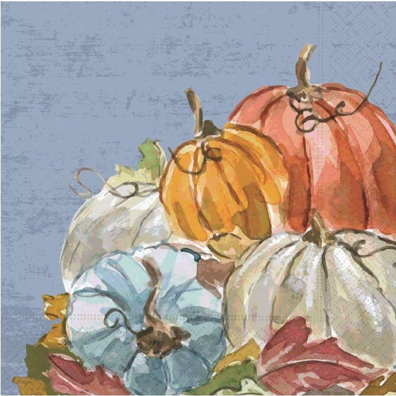 - Napkin design features an assortment of pumpkins on the front, with a single orange pumpkin on back, printed on a blue background