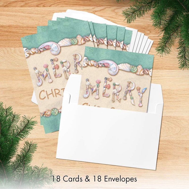 Designer Greetings Christmas Cards - Box Set 18 Cards and 18 Envelopes - Merry Christmas Written in the Sand with Seashells Spelling Merry
