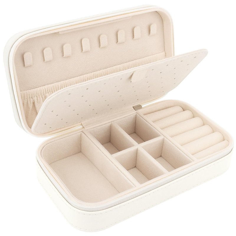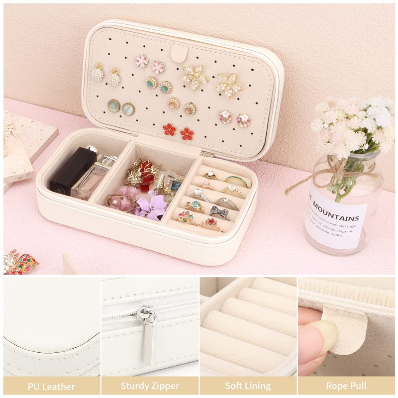- šćPRACTICAL & DELICATEćBuilt with smooth zipper and removable divisions, you can adjust the space according to your needs. Portable jewelry box is spacious enough with many different compartments to store your rings, earrings, bracelet, pendant, watches, lipstick, brooches. It can hold the jewelry and keep necklaces and bracelets from tangling.
