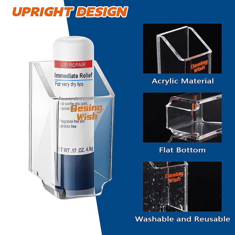 - 👍 UPRIGHT OR WALL-MOUNTED - Coming with removable adhesive, you can stick the acrylic lip balm holder on desk, tile, glass and cabinet. (Note: not suitable for wall) You can also place it randomly on a flat surface, or use removable adhesive to fix the bottom to the table.