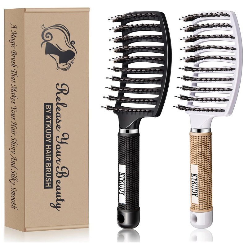 Detangling Brush Boar Bristles Set KTKUDY Hair Brush Curved and Vented Detangler Brush for Women Men Kids Wet and Dry Hair (Black&White)