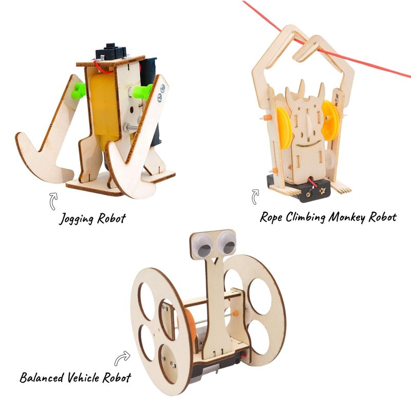 - Build Robot Project: This is a wooden robot building kits for kids ages 6-14, include 5 robot model with unique features and functions: Coin Swallowing Robot, Mechanical Dinosaur Robot, Balance Car Robot, Rope Climbing Robot and Jogging Robot. It's an excellent STEM science project for kids age 6+ interested in robotics.
