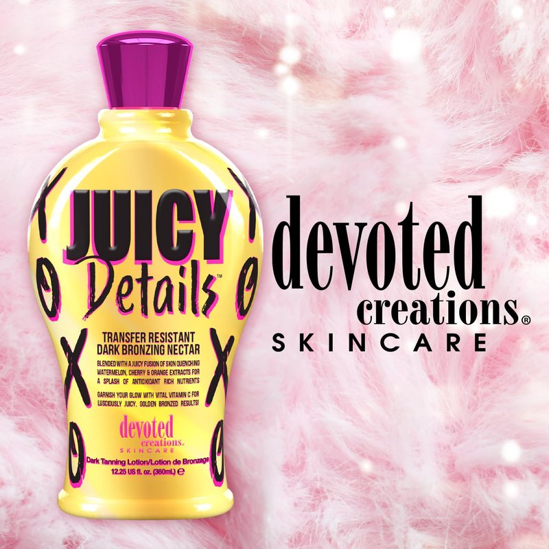 Take a sip of sunshine with Devoted Creations New Juicy Details! This color concoction is fresh squeezed with juicy amounts of golden glow bronzers to quench your craving for color, without transferring to your clothes! This luscious lotion is dripping with Watermelon, Cherry and Orange extracts to furnish a fusion of refreshing antioxidants and essential skin loving nutrients! Garnished with glowing Golden C and Superox C allow this blended elixir to produce a more luminous, plump and hydrated finish to the skin. For a drink of dark color, we have the recipe for results…and its juicy!