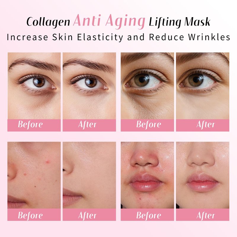 - COLLAGEN FACE MASK: Collagen is one of the main components of the skin, and as we age, the skin loses collagen, leading to wrinkles and sagging. The deep collagen anti-wrinkle lifting mask is packed with a significant amount of collagen, which helps to effectively restore the collagen required by the skin, enhancing its elasticity and radiance.