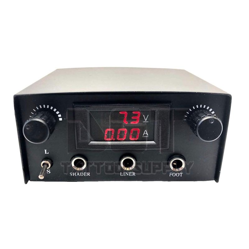Digital Dual Tattoo Power Supply with 2pcs clip cord and stainless steel flat foot pedal. Professional quality and built to last. These units are powerful and operate trouble-free. LCD display with Voltage and Machine AMP Display, can easily switch between liner or shader mode. Digital Dual Tattoo Power Supply: Pro-quality, digital power supply system. Precision regulated stable current output 1.5-18v LCD Display with current volts. Overload protection built in. U.S. Standard power plug included. Input: 110v / 220v ,2pcs Flexible Tattoo Machine Clip Cord, Standard 1/4" stainless-steel pedal phono-plug. Flexible sturdy springs. Stainless long-life clips for solid machine contact. Stainless Steel Flat Tattoo Foot Pedal Non-skid anti-marring base. The ultra low-profile design is easy on the ankle and provides superb machine control.