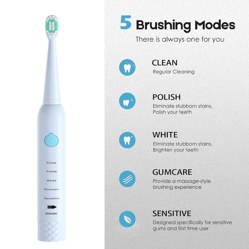 - ★【5 MODES: CLEAN, WHITE, SENSITIVE, POLISH, GUM CARE】 - Giving each person the option to find the clean best suited for them. A Low Power Indicator also alerts you when to charge the toothbrush.