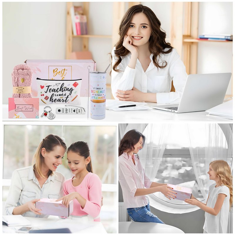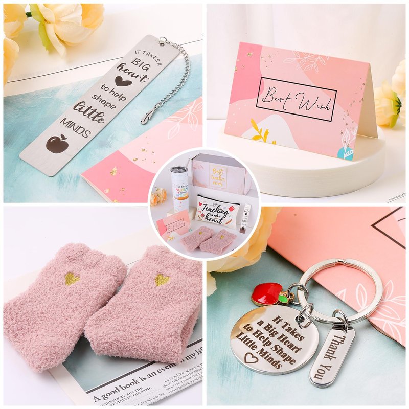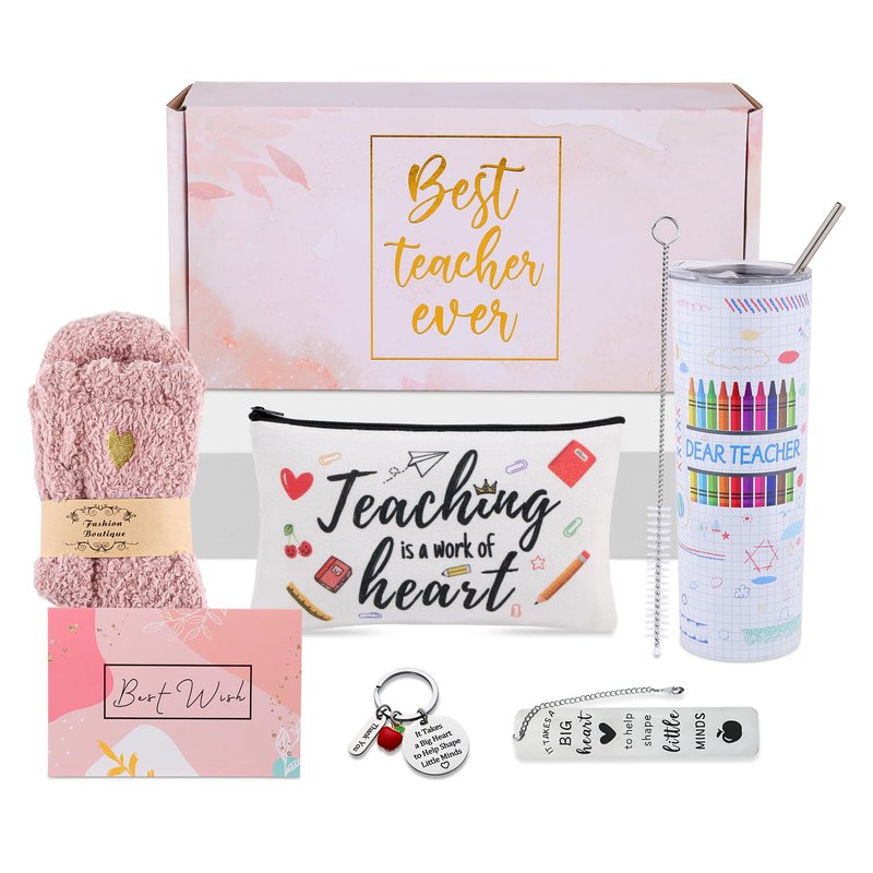 - 🎁Teacher Gifts--- Unique gifts box filled with lovely gifts mainly includes a 20 oz original design stainless steel tumbler,a canvas pouch bag,a bookmark, a keychain,a pair of fuzzy socks and best wish card. Each item is carefully selected as teacher gifts for women.