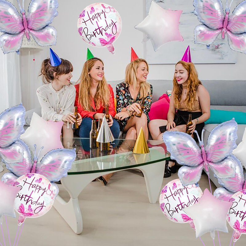 - Package: content 2 pcs of pink purple butterfly mylar foil balloons,2 pcs happy birthday butterfly foil balloons and 2 pcs pink white star balloons,they are enough to meet your need to decorate your birthday party.