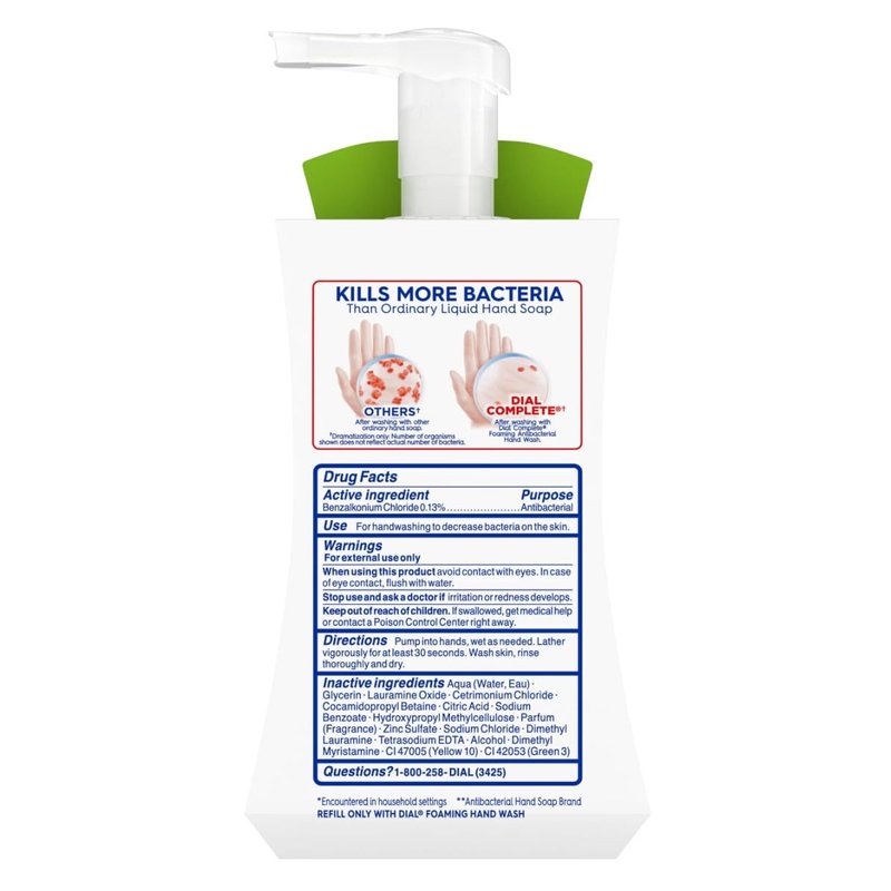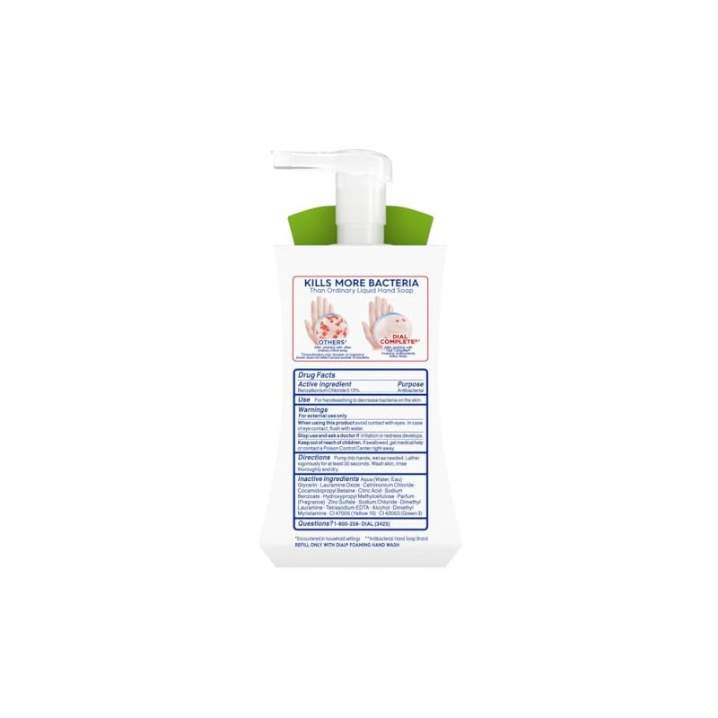 RICH, CREAMY LATHER: Experience the luxurious, creamy foaming formula with Dial antibacterial foaming hand washes for your hands to love. PROTECT AGAINST BACTERIA: Kills 99.99% of Bacteria* (*Bacteria encountered in household settings) TOUGH BUT GENTLE: Formulated with antibacterial ingredients, Dial Complete is tough on bacteria but gentle on skin. FOR THE FAMILY: Pass on the Dial heritage to the hands you care about most. Formulated to be gentle on skin, even on the smallest hands. HOW TO USE: 1. Pump into DRY hands 2. Lather vigorously in DRY hands for at least 20 seconds 3. Rinse clean with water. Remember: Pumping soap into dry hands saves energy and water!