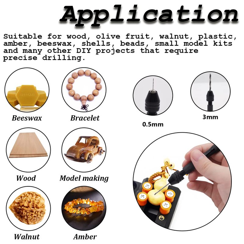 - Scope of Use: Suitable for wood, olive fruit, walnut, plastic, amber, beeswax, shells, beads, small model kits and many other DIY projects that require precise drilling.