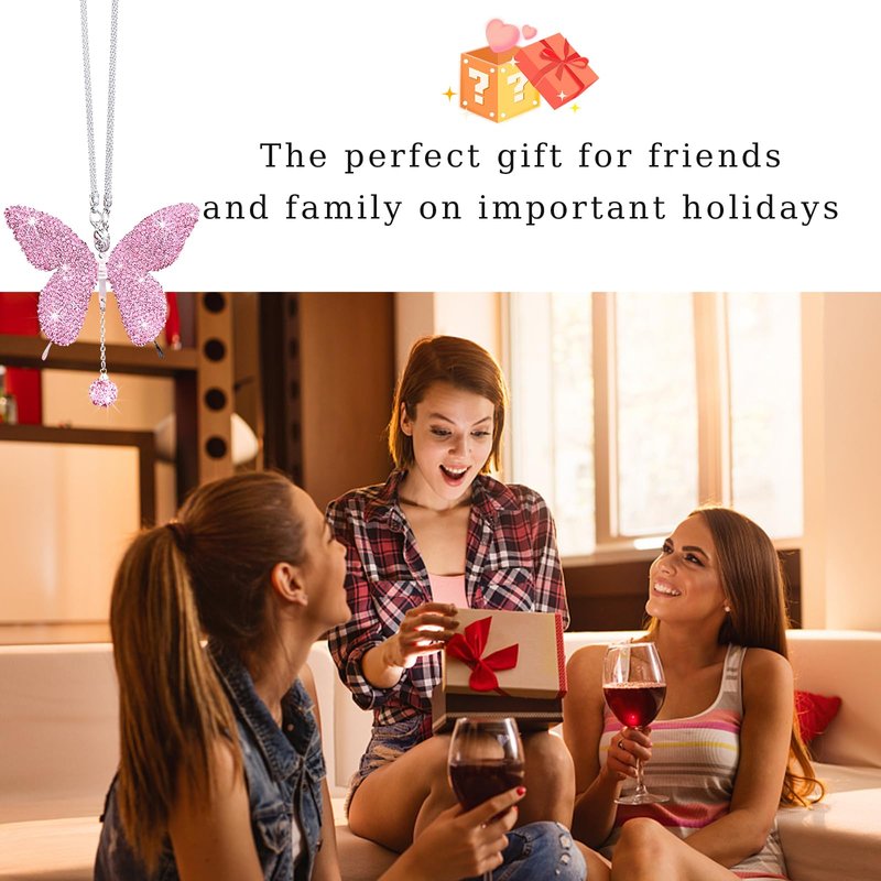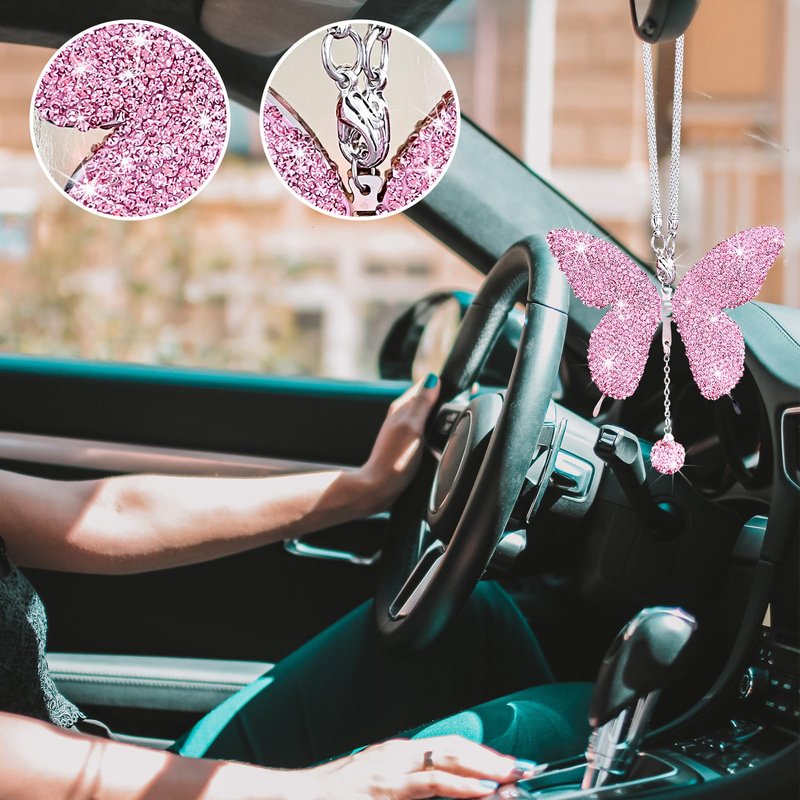 Dickno Bling Butterfly Car Accessories for Women, Diamond Car Rear View Mirror Ornament Pendant, Valentine's Day Gift, Crystal Car Hanging Decoration, Cute Rhinestone Pendant (Pink)