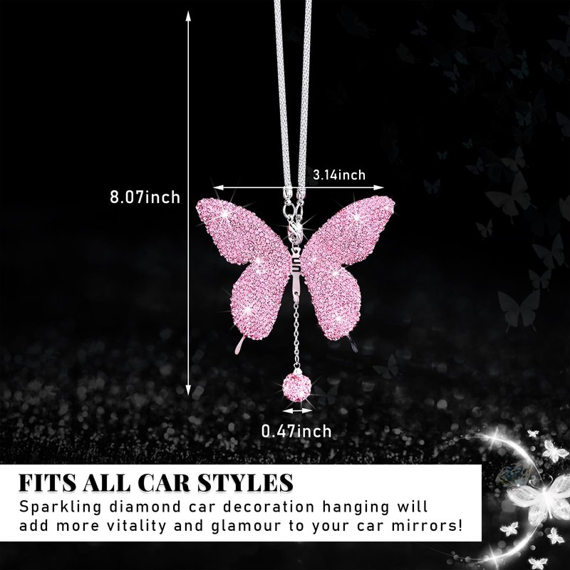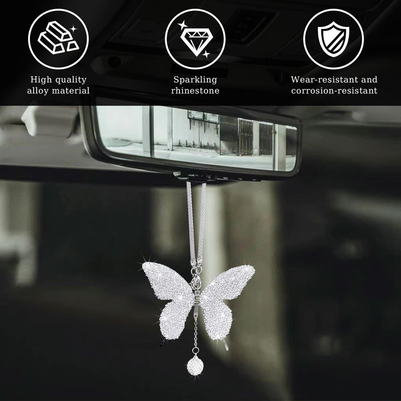 - 【High Quality】: The car rearview mirror butterfly pendant is made of high quality alloy and shiny rhinestones while the alloy part is plated by electroplating process, which is durable and colorfast, featuring a certain weight and nice texture and looks sparkling. The chain part of it is made of alloy, the outside of this product is rhinestone and clay and the butterfly pattern is stainless steel inside.