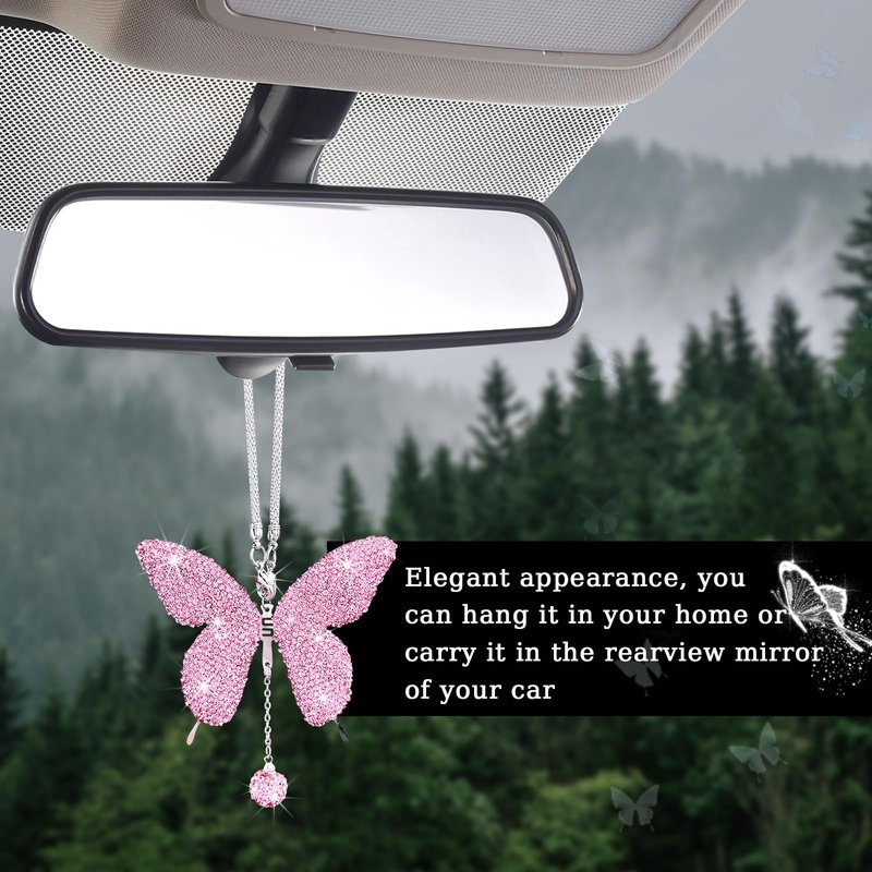 -A design of detailed butterfly, this rearview mirror pendant is made of high quality rhinestones and alloy, It is wear-resistant and antioxidant, you don't have to worry about crippling color. What's more, the surface is inlaid with a crystal ball when the sunlight shines on the car, the car will be sparkling and exudes infinite charm.