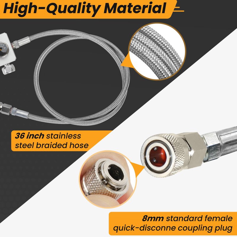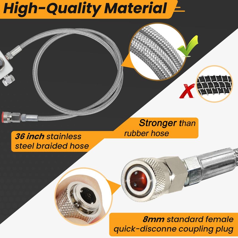 - NEW UPGRADE: Yoke fill station equipped with a 36-inch stainless steel braided fuel filler pipe for longer service life and 8mm standard female quick-disconnect coupling plug for enhanced convenience. The latest double O-ring design can extend the service life.